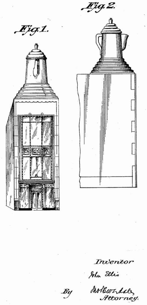 A store-front building design for Ellis Importing Company of Philadelphia. 1930. Invented by John Ellis.