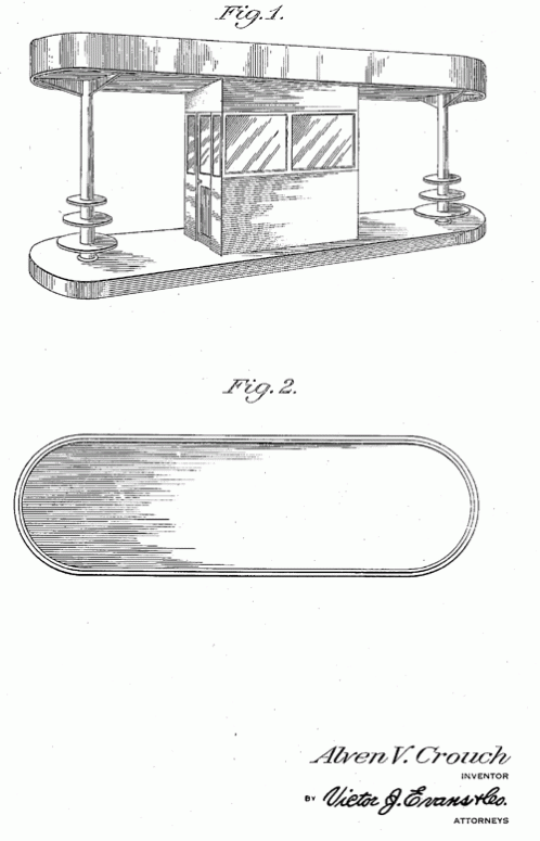 Stepped circular platforms are the perfect place to display motor oil at this service station island. 1938. Invented by Alven V. Crouch.