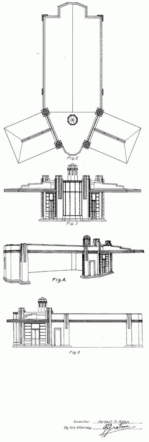 Here is a more traditional and wonderfully symmetrical design for a Shell Oil Company service station. Designer Herbert O. Alden is also responsible for the Gerry Building in Los Angeles. 1933. Invented by Herbert O. Alden.