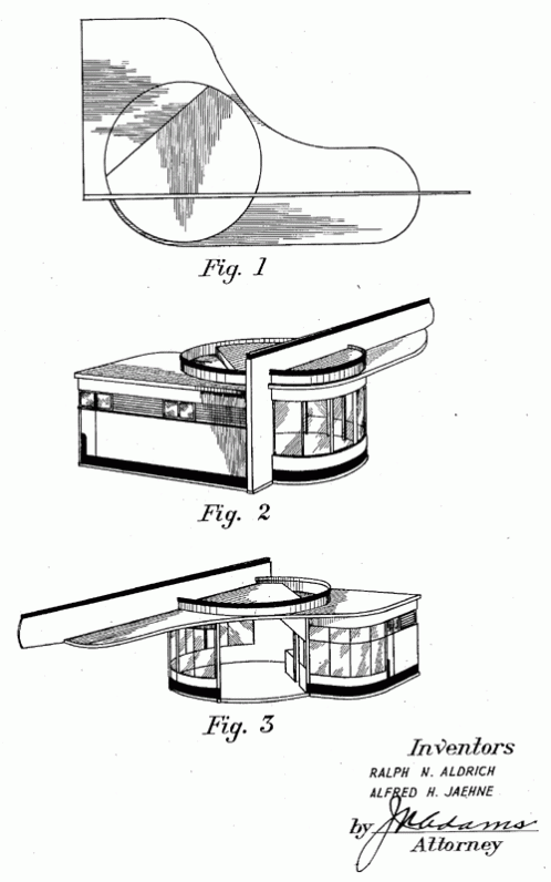 A piano shaped design for a gas station with what appears to be a tiny bay. 1941. Invented by Ralph N. Aldrich and Alfred H. Jaehne.